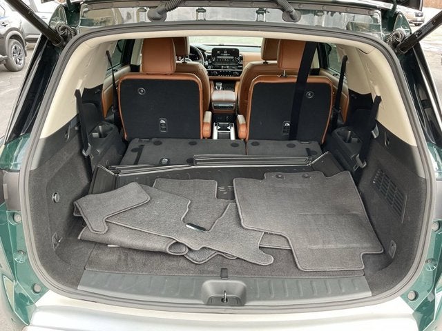 The stunning green exterior, complemented by the sophisticated black accents, gives this Pathfinder a bold and commanding presence on the road. Step inside and you'll be greeted by a luxurious cabin adorned with premium leather seating, heated and ventilated front seats, and a host of advanced technology features that will keep you connected and entertained.
